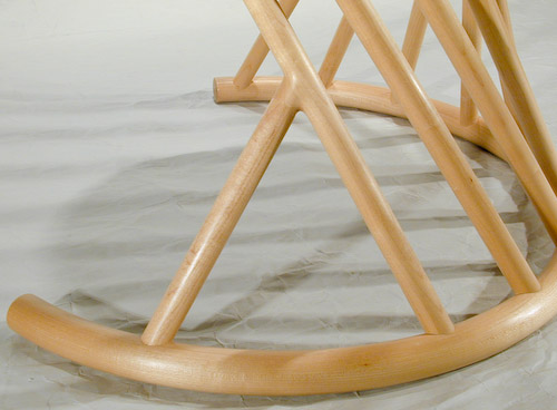 Conviviality is the theme for these chairs. They twist toward each other as if the chairs themselves are in conversation. These chairs are made from hard-rock maple (Acer saccharum) also known as sugar maple. The 'verticals' are solid. The arm and base are laminated and the seat is constructed as shown below.