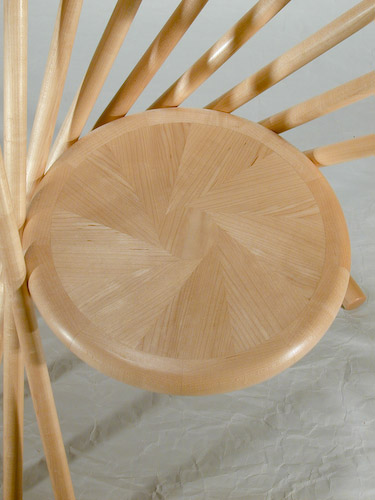 The rim of the seat is coopered from 9 pieces (to match the 9 legs). The seat is MDF clad with 3mm veneers cut from the same stock as the legs and arms. There are 9 segments with a circle in the middle. The rim is sculpted to partially merge with the legs which are fastened by screws from inside the seat.