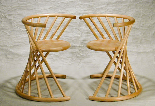 Conviviality is the theme for these chairs. They twist toward each other as if the chairs themselves are in conversation. These chairs are made from hard-rock maple (Acer saccharum) also known as sugar maple. The 'verticals' are solid. The arm and base are laminated and the seat is constructed as shown below.